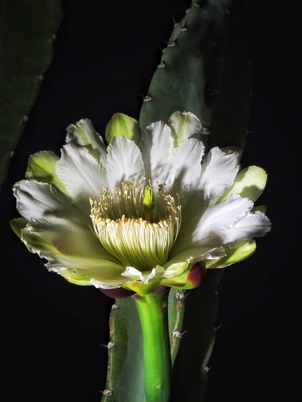 Image: 10/02/25 A night blooming cereus beaming over my neighbor’s yard into mine allows me to take a portrait of her with a flashlight and cell phone on the night of the Marinette interception. The contrast of beauty and horror is a tough to carry these days. © Kathleen Dreier/ Kathleen Dreier Photography/ Voices Of Race